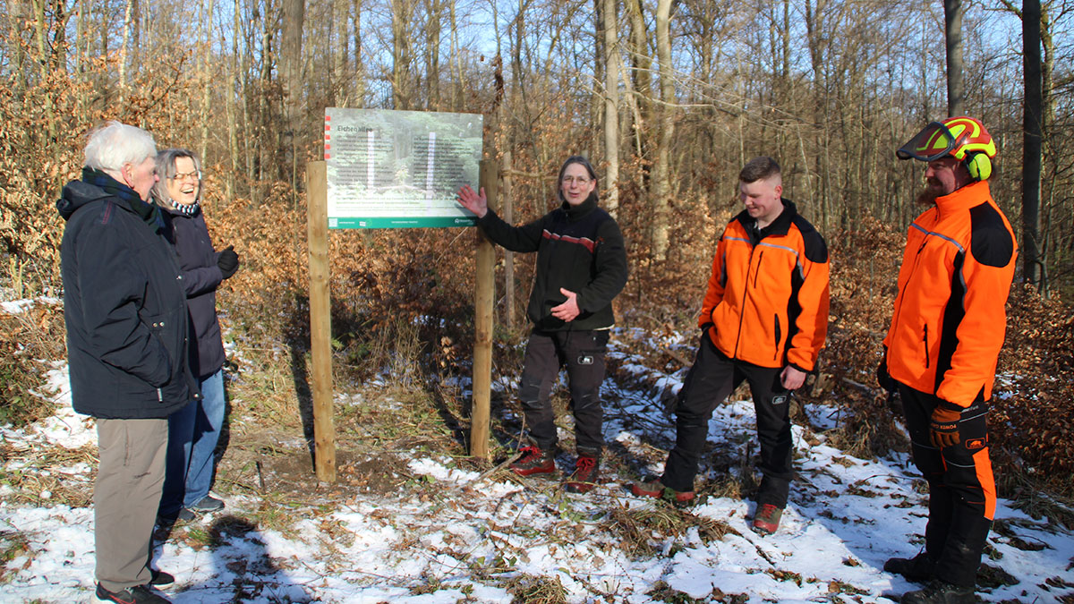 Am 20. Februar 2026 wurde das Engagement der Sponsoren mit der Aufstellung von zwei Informationstafeln am Beginn und Ende der Eichenallee gewürdigt, die zugleich die Allee wieder besser wahrnehmbar machen. Dieter Hankel und Birgit Mietzner, HWGV Kassel e.V., dankten den Anwesenden und den Ideengebern von HessenForst für das hervorragende Projekt, das alle Naturliebhaber von Jahr zu Jahr mehr erfreuen wird. Im Gegenzug dankten Katharina Brämer, HessenForst Landesbetriebsleitung – Spenden & Sponsoring, und Dagmar Löffler, Revierleitung Kirchditmold, dem HWGV Kassel und den anderen Sponsoren für die Unterstützung.